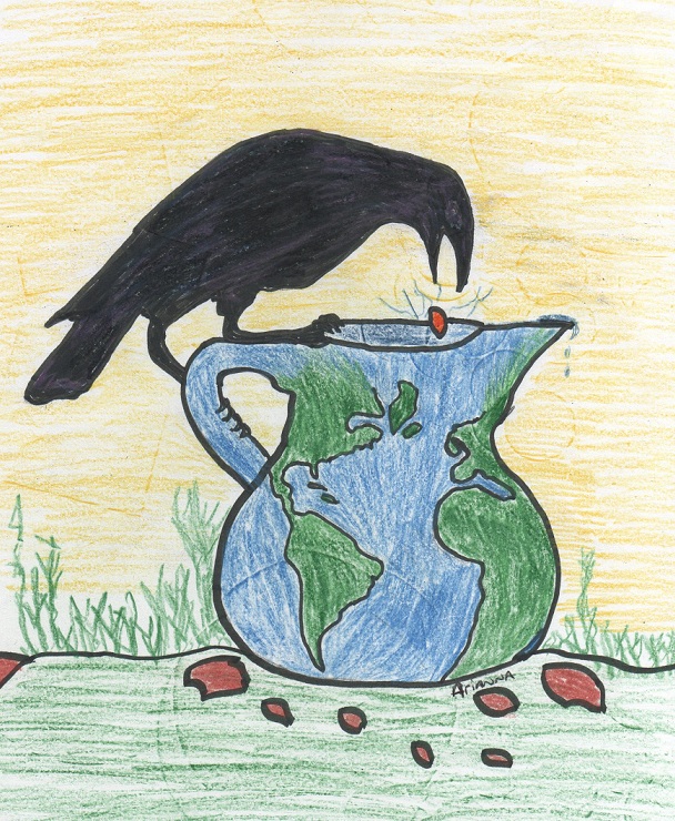The Crow and the Water Pitcher is a famous Aesop Fable. A very thirsty crow sees a water pitcher on the ground. It must have been abandoned by those silly humans. Being quite the intelligent being that she is she has a looksee and aha, there is water in the pitcher. But her beak can’t reach all the way down to where the water level is. Hmm. What to do? How to get at the water? An idea strikes her. She picks up a pebble and puts in the pitcher. Not much happens. She puts in another and another. The water rises just a little bit as each pebble displaces the water. She looks for more pebbles and continues to put them in the pitcher. The water continues to rise as more pebbles are put into the pitcher. The crow continues to test to see if she can reach the water. Almost. More pebbles and then more testing. Soon, the water is where she can reach it with her beak and she drinks her fill. Ahhh, happy crow. Moral of the story: “Necessity is the mother of invention.”